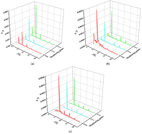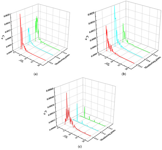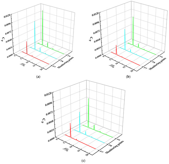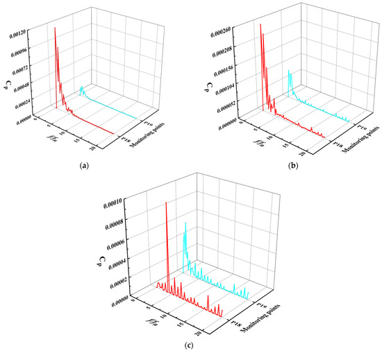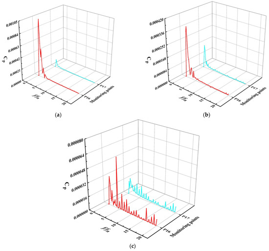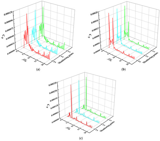 Spectra of pressure fluctuation at monitoring points 16–17 of straight pipe outlet flow channel: (a) 0.8 Qbep, (b) 1.0 Qbep, (c) 1.2 Qbep.