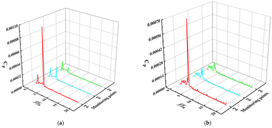 Figure 21 and Figure 22 show the pressure fluctuation spectra of monitoring points 16–17 and 18–19, respectively. Under the 0.8 Qbep and 1.0 Qbep conditions, the four monitoring points were greatly affected by low-frequency pulsation, and the corresponding frequency conversion ratio of pressure pulsation coefficient in the dominant position was within 3 times that of the frequency conversion. The amplitude of pressure coefficient of each monitoring point decreased with the increase of flow rate. The distance between monitoring points 17 and 19 and the outlet section of guide vane was large, and it was less affected by velocity circulation and elbow. The pressure coefficient amplitude of monitoring point 17 was much smaller than that of monitoring point 16, and the pressure coefficient amplitude of monitoring point 19 was much smaller than that of monitoring point 18. Under the 1.2 Qbep condition, the spectra of monitoring point 17 and monitoring point 19 fluctuated, and there was high-frequency fluctuation. The main frequency was still within 3 times rotating frequency, and the main frequencies of monitoring point 16 and monitoring point 18 were 4 times the rotating frequency.