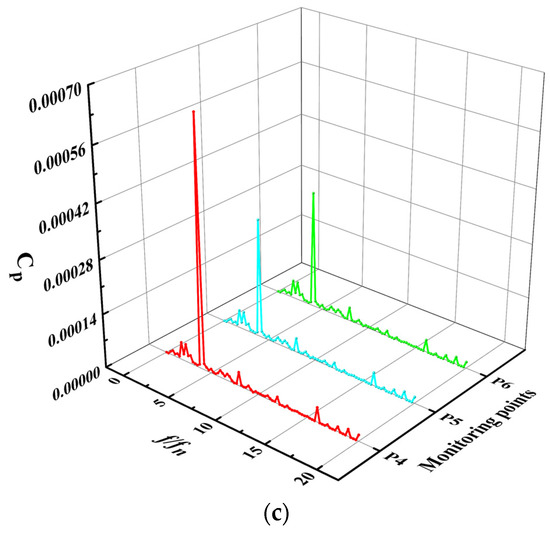 Spectra of monitoring points 4–6 of elbow oblique inlet flow channel: (a) 0.8 Qbep, (b) 1.0 Qbep, (c) 1.2 Qbep.