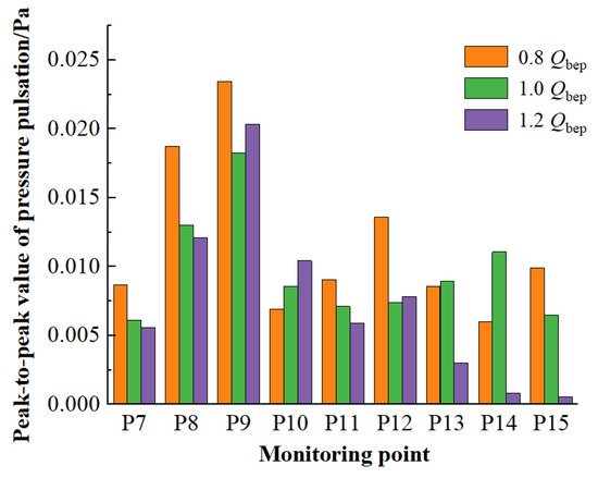 In order to further analyze the pressure fluctuation of the impeller inlet section and the dynamic–static interference interface of the impeller guide vane and the outlet section of the guide vane of the inclined-axis extended flow pump, the peak-to-peak values of the monitoring points 7–15 were calculated. Figure 23 shows the peak-to-peak values of the pressure fluctuation for each monitoring point under different flow conditions. The peak-to-peak value of the impeller inlet section increased from the hub to the rim due to the influence of blade design. The peak-to-peak values at the middle point of the flow channel and the rim were generally higher than those at the impeller outlet section and the guide vane outlet section, indicating that the flow was affected by the impeller rotation before entering the impeller, and the flow pattern was unstable. The flow impacts the pressure surface or suction surface of the blade, resulting in a large pressure pulsation. When the flow flowed through the impeller and was affected by the guide vane rectification, the pressure gradient decreased and the pulsation pressure decreased. With the increase of flow rate, the load on the pressure surface and suction surface of the blade decreased gradually, the pressure gradient decreased, and the peak value decreased gradually. The peak value of pressure fluctuation at the hub of different sections changed little, and the peak value of pressure fluctuation at the rim of the impeller was the largest under the 1.2 Qbep condition. The peak value at the rim of the impeller inlet reached 0.02 Pa and the peak value at the rim of the guide vane outlet was only 0.00055 Pa, which is a reduction of 97.25%. At this time, the flow pattern at the rim of the guide vane outlet was better and less affected by the impeller rotation.