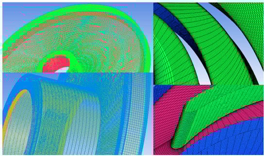 The computational domain was divided into four parts, which were impeller, front impeller side room, back impeller side room, and volute. Meanwhile, the inlet of impeller and outlet of volute were both extended with tubes to minimize the effects of reverse flow on the key flow field in the impeller and volute. The computational domain is shown in Figure 1. It consists of an impeller, a volute, two impeller side gaps, and extension tubes. The commercial software ANSYS ICEM CFD was used to generate structured grids. The grid of the prototype impeller is displayed in Figure 2. The grids near the walls were carefully refined and the y+ of the key surfaces in the impeller and impeller side gaps was within 50 and 15, respectively.