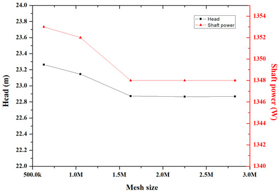 Figure 3 shows the results of the grid sensitivity test on the prototype impeller at the designed flow rate. It is noticeable that the results converged when the number of impeller grid cells was 1.6 million. The total quantity of grid cells of the whole model was 2.2 million and the grid quality was checked.