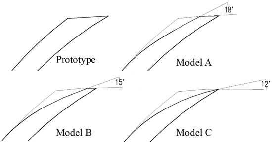 Based on the prototype pump introduced above, a set of modifications to the blade trailing edge profiles were conducted. As a result of the modifications, the outlet angle of the blade pressure side became relatively smaller than the blade suction side outlet angle. These modifications had different outlet angles. Figure 4 shows the details of these modifications. The blade angle at the trailing edge () of prototype was 21 degrees. The pressure side outlet angle of models A, B, and C was 18 degrees, 15 degrees, and 12 degrees, respectively.