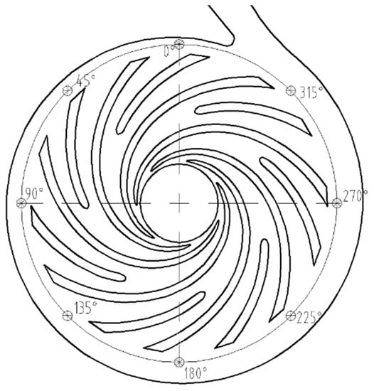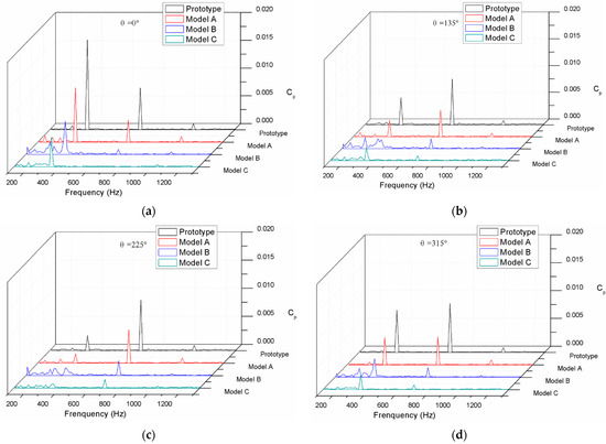 The pressure fluctuations performances of the modifications and prototype pump were predicted and compared through unsteady numerical simulations for the purpose of investigating the influence of the blade trailing modifications on the hydraulic fluctuation. The unsteady numerical simulations were conducted at the nominal flow rate of 18 m3/h with a rotating speed of 2950 r/min. The virtual monitor points were set near the impeller outlet, whose specific positions are presented in Figure 5. These monitor points were equidistantly distributed in a circle with a diameter of 152 mm, and the angle varied from θ = 0° to θ = 315°. The pressure fluctuation of the prototype pump and the modifications were predicted at the nominal flow rate and processed into pressure spectra by means of Fast Fourier Transformation (FFT), with the spectra at four monitor points, which are shown in Figure 6.
