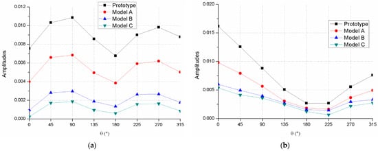 According to Figure 6, the blade-passing frequency was 688 Hz where the amplitudes were dominant among the frequency domains. The simulation result that the amplitudes were dominant at agrees with former research that showed that the blade–tongue interaction is the main source contributing to pressure fluctuations [21,25]. The amplitudes of the spectra at eight monitor points were normalized and are presented in Figure 7. Because of the employment of splitter blades, there was another peak, whose amplitudes are shown in Figure 8, and was motivated at the frequency of 344 Hz, which is half of the . As is seen in Figure 7, the spectra amplitudes at and 0.5 of the four models were distributed at the eight circumferential positions in a nearly synchronized manner. The difference of the amplitudes of the four models can be clearly figured out, which indicates that there was a gradient of pressure fluctuation intensity among the four models. The prototype had the strongest pressure fluctuation intensity, followed by models A, B, and C. Former investigations [5,13] have demonstrated that the amplitudes at the circumferential position should present a tendency with 14 local peaks and valleys because of the blade–tongue interaction. However, there were only eight monitor points, so it was unable to be exhibited. The pressure fluctuation curves of the prototype and the modifications at the circumferential positions against the time domain are presented in Figure 8. The figures show the static pressure plots within the time of one circle. It is shown that the curves of the prototype had stronger fluctuation and the fluctuation intensity was gradually mitigated from Model A to Model C. The standard deviations of the pressure fluctuation plots around the circumference of the impeller outlet were also extracted and normalized in Equation (2), which can be regarded as an indicator of pressure fluctuation intensity.