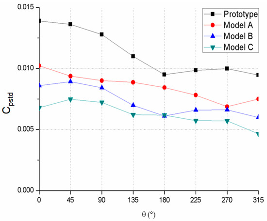 Figure 9 shows the circumferential distributions of the pressure fluctuation intensity of the models. As is shown in Figure 9, the normalized standard deviations of the four models showed a similar pressure fluctuation intensity distribution. The pressure fluctuation intensity of the models can be compared. Therefore, it is concluded that with the enhancement of blade trailing edge modification, the pressure fluctuation is suppressed.