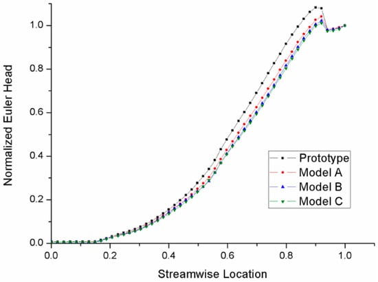 Figure 10 gives the normalized Euler head distribution of the four models on the streamwise location. The rising curves display how the fluid obtained kinetic energy in the impeller. The Euler head was averaged on the circumference and normalized with Equation (3). The streamwise location in the impeller was specially defined. The inlet of impeller was set as 0 and the outlet as 1 on the streamwise location in a linear order. The leading edge of the splitter blade was at 0.5 in the streamwise location, so it was noticeable that the curve slope was higher in the second half. The modifications had almost the same tendency along the whole range, which is similar to the results of the blade trailing edge modification on a mix-flow pump conducted by Wu et al. [12]. In addition, the curve of the prototype rose faster than the three modifications. There was a Euler head drop near the outlet area, where there were no impeller blades transporting energy. The Euler head drop of the prototype was evidently larger than those of the modifications. This shows that the trailing edge trimming made the streamwise change in energy become milder. There were still slight differences between the modifications, which means that the scale of trimming on the blade trailing edge also made a small difference. It can be explained that when the impeller blade trailing edge is cut on the pressure side, the change of blade angle affects the work capacity of the blade near the trailing edge, thus affecting the energy distribution.
