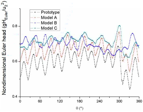 Figure 10 displays the energy distribution in the whole streamwise range. The energy distribution near the outlet area of the impeller on the circumference was also analyzed. The circumferential Euler head distributions were extracted out of the impellers of the four models from static simulation results and are displayed in Figure 11. The Euler head data were collected at a surface of revolution whose center was located at the axis of the impeller. The radius of the surface of revolution was 72 mm, with a gap of 6 mm to the trailing edge of the impeller blades. The Euler head data at the same angular position were recorded. As observed in Figure 11, the normalized Euler head curves of the prototype and Model A were similar, with 14 peaks and 14 valleys due to the 14 impeller blades. The deep valley among θ = 300° and θ = 330° area was influenced by the volute tongue. When it comes to Model B, the normalized Euler head distribution had a different pattern than the prototype and Model C. As for Model C, there were only seven peaks and valleys. In addition, the peaks and valleys of the Model C curve were two times the width of the peaks and valleys of the prototype and Model A curves. It is assumed that the sharpened blade trailing edge of Model C had an evident influence on the circumferential distribution of the Euler head so that the two adjacent high Euler head regions combined together. The pattern of the Model B curve was supposed to be a transition state between Model A and Model C, whose peaks and valleys fluctuated much more mildly than those of the prototype and Model A. The fluctuation intensity in Figure 11, which is also regarded as the uniformity of the circumferential Euler head distribution, is a direct scale of energy uniformity. To assess the fluctuation intensity quantitatively, the standard deviation of the normalized Euler head was calculated. For the purpose of getting rid of the influence of the volute tongue, the standard deviation calculation area was set from θ = 0° to θ = 270°.