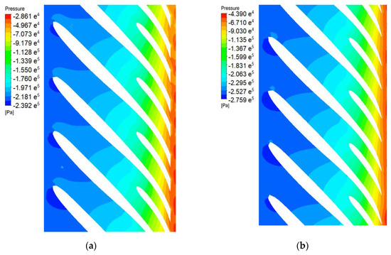 Comparison of static pressure contours (span = 0.5) between (a) the prototype; (b) Model C.