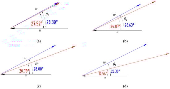 Pressure side velocity vector triangle of averaged local velocities in Table 3: (a) R = 59 mm; (b) R = 61 mm; (c) R = 63 mm; (d) R = 65 mm. Black: peripheral velocity; blue: relative velocity of the prototype; red: relative velocity of Model C.