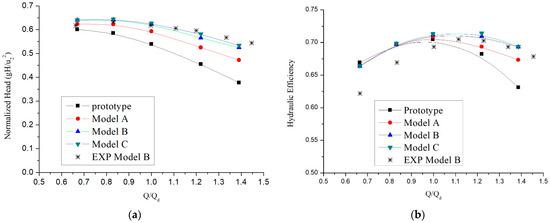 The hydraulic performances of the prototype and the modifications under five operating conditions were predicted by means of steady CFD calculations. The heads at different flow rates were normalized and the curves were fitted by B-Spline. The comparison of the head coefficients is shown in Figure 16. According to Figure 16a, the head of the prototype was under the modifications in all operating conditions. The difference in the three modifications also shows that the head rose as the blade trailing edge trimming advanced from Model A to Model C. The experiment results of Model B also agree well with the simulated results. Figure 16b shows the hydraulic efficiencies of the prototype and the modifications. According to Figure 16b, the hydraulic efficiencies of the modifications were above the prototype in all operating conditions. The high efficiency areas of the modifications were wider than those of the prototype at a large flow rate. The hydraulic efficiency also rose when the blade trailing edge trimming scale was enhanced. There were BEP shifts at the modifications but the efficiencies of the modifications at the designed flow rate were still acceptable, as they were not lower than those of the prototype. The numerical simulations demonstrate that the blade trailing modifications influenced the head and hydraulic efficiency at the same time.