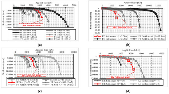 For pile geometrical parameters (category A), load-settlement results of the nine numerical pile models with different diameters and equal length (9.50 m) are presented in Figure 4a. Additionally, the results of the three numerical equal-diameter (1.30 m) pile models with different lengths are shown in Figure 4b. Those results were compared with the load–settlement relationship of the calibrated model (Figure 1) to assess the change in pile load settlement performance due to variation in either pile diameter D or pile length L.