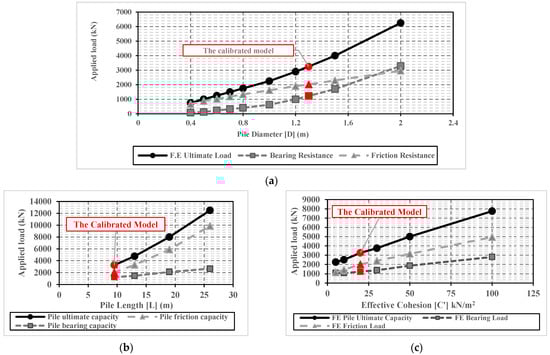 Figure 4a,b highlight the effect of pile diameter and length on the ultimate pile capacity and the induced settlement at failure. Hence, the ultimate capacity increases with increases in pile diameter and length. Consequently, the induced settlement at the failure state is also increased. A significant increase in pile settlement is also observed at the last load increment in the results of the 12 finite element models (category A), as the induced pile settlement at the last load increment (failure load) ranged from about one and a half to more than two times the obtained settlement value at the pre-last loading increment.