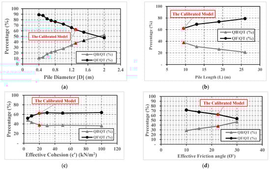 In the same line, percentages of load transferred by bearing and by friction are calculated relative to total obtained ultimate capacity (QB/QT and QF/QT) for each of the 29 numerical models, and the variations of those percentages with each factor in both categories are given in Figure 6a–f.