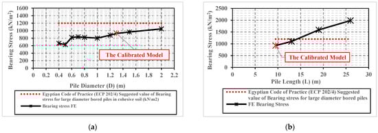 As shown in Figure 7a the almost equal value of bearing stress (about 600 kN/m2) can be seen for piles with small diameters of 0.40 m and 0.50 m. A significant increase in bearing stress value was observed in the case of a pile with a diameter of 0.60 m, as the bearing stress increases to about 800 kN/m2, which is about 33% greater than the obtained bearing stress at 0.4 and 0.5 m pile diameters. Further, almost the same value of bearing stress was obtained below the bases of piles with diameters of 0.6, 0.7, 0.8, and 1.0 m. Bearing stress increases again with pile diameter increases for piles with diameters greater than 1.0 m, to achieve its maximum value of 1050 kN/m2 below the 2.0 m diameter pile base.