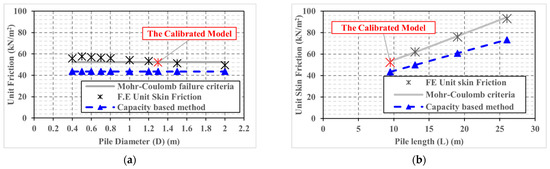 On the other hand, the calculated soil skin friction values using the capacity-based method [42] are close to the numerical results, except for the three cases with different lengths (Figure 8b) and the last two cases with greater friction angles (Figure 8d). The difference between the numerical results and those obtained using the Meyerhof formula ranges from 10% to 21%. However, the Meyerhof method underestimated the unit skin friction of all cases. Of note, the capacity-based method takes the effect of pile diameter (D), length (L), clay effective cohesion (c’), and soil effective friction angle (Ø’) into account, in contrast to the settlement-based methods that ignore the effect of several influencing factors, as presented in Section 4.3.