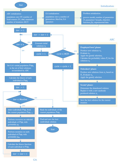 During the initialization phase of the algorithm, values of the input parameters of ABC and GA are set. The optimization problem is defined, as well as the problem parameters and their bounds.