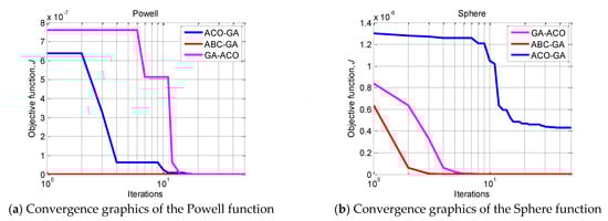 To illustrate the efficiency of ABC-GA, the convergence of the compared hybrid algorithms towards the optima for 30 runs is presented in Figure 2. Two benchmark functions, Sphere and Powell, are chosen as the most indicative. For the rest of the functions, the superiority of ABC-GA is very clearly shown by the results in Table 3. ACO-FA is not included in the chart because it produces much worse results.