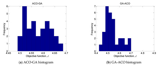 The presented results show that for a small population size (10) and only 25 iterations, the ABC algorithm produces a very good initial solution for GA. To form the initial population for GA, ABC with these particular parameters’ settings is executed 50 times. Next, based on this initial population, GA converges to a near-optimal solution for 50 generations. GA alone can reach such a result using a population of 100-200 chromosomes for at least 200 iterations. For example, solving the model. with (6)–(8), GA’s best solution with J = 4.4359 is obtained for a population size of 200 and 200 generations [42] and J = 4.4396 with 180 individuals for 200 generations [35].