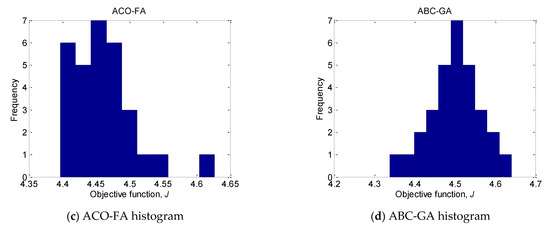 The worst result (J = 4.7016) obtained by ABC-GA shows that some further improvement of the GA evolution is necessary in order to achieve better results. It has been observed in the literature that the sampling capability of GA is greatly affected by the population size [46]. Another problem of GA is the algorithm’s parameters setting. The choice of appropriate control parameters is a tedious task. These will be directions for the process of improving the performance of GA in the ABC-GA hybrid algorithm proposed here.