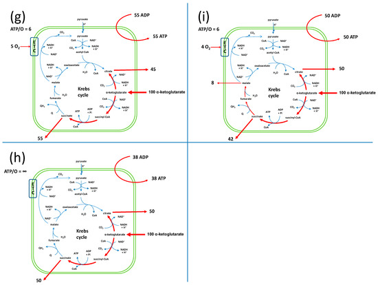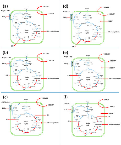 The description of the EFMs of the yeast mitochondrial metabolism showed that, in principle, any TCA segment can be taken from AKG leading to any TCA intermediate output (Figure 1) with ATP/O ratios ranging from 0.5 to 6 except for the EFM of Figure 1h, for which there was no oxygen consumption. The already reported ATP/O ratio of 2.3 [20] was close to the one of 2.15 measured in the EFMs of Figure 1a,c, which corresponded in our system to an exit of succinate on the one hand or malate and citrate on the other hand. However, because the metabolic fluxes at a steady state could be the combination of several EFMs with different ATP/O values, a value of 2.3 could be achieved in this combination.