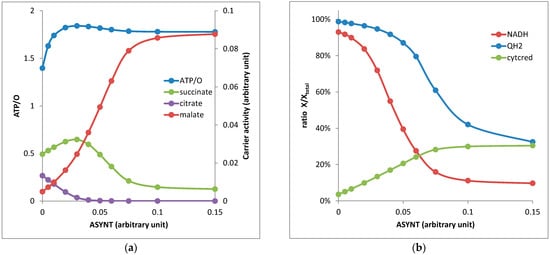 Figure 2. Energy metabolism of isolated yeast mitochondria respiring on AKG as a function of ATP synthase activity: (a) ATP/O ratio (left scale) and output fluxes through the Odc1 carrier against the AKG input (in arbitrary units, right scale) and (b) NADH/NADtotal and QH2/Qtotal and reduced cyt c/cyt ctotal ratios. The parameters of the kinetic model are listed in Supplementary Material S1.
