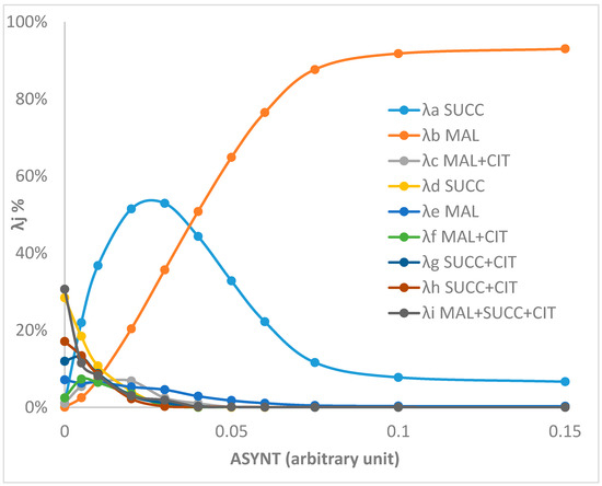 Figure 3. Decomposition of the fluxes as a function of the EFMs of the network involving AKG, ADP and Pi input (see details in Supplementary Material S2). The λj values refer to EFMj represented in Figure 1. For each ASYNT value, the metabolism at a steady state is equal to Σλj*EFMj (j = a, b,…, i) with Σλj = 1. The metabolite(s) indicated after the λj is/are the metabolite(s) that goes/go out.