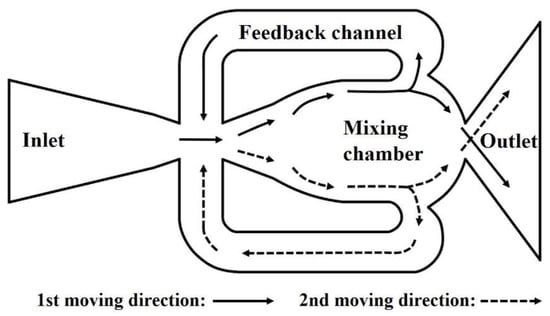 Fluidic oscillator has a simple shape and generates a vibrating jet from a steady inlet flow. Figure 1 shows the working principle of a fluidic oscillator with two feedback channels. When a constant pressure is applied to the inlet, the main stream flows along one wall of the mixing chamber by the Coanda effect. Most of the main stream proceeds to the outlet, but a part of the stream is introduced into a feedback channel to change the direction of the main stream at the inlet throat. This phenomenon is repeated to generate a vibrating jet at the outlet.