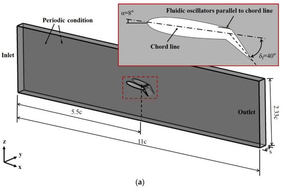 Only three oscillators are included in the computational domain using periodic conditions at the sided boundaries, as shown in Figure 2. The total computational domain consists of the external flow domain of the airfoil (Figure 2a) and the internal domain of the fluidic oscillator (Figure 2b). The chord length of the airfoil was set to 305 mm, and the span length was set to 99 mm including three fluidic oscillators. The angle of attack (α) was fixed at 8°, and the flap angle (δf) was fixed at 40°. The detailed dimensions of the fluidic oscillator (Figure 2b) are shown in Table 1.