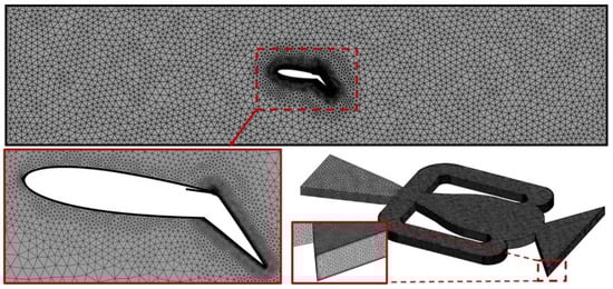 A typical grid system is shown in Figure 5. Unstructured tetrahedral meshes were created using ICEM CFD 15.0® in all domains and, to resolve the high-velocity gradients in the boundary layers, 19 and 12 prism layers were placed on the airfoil surface and the oscillator walls, respectively, with an expansion ratio of 1.2. In all cases, the first grid points on a wall surface were located at y+ < 2.