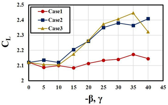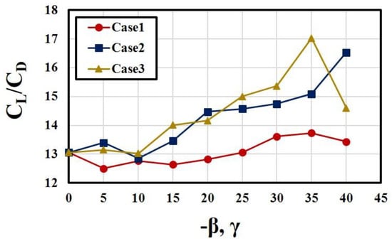 The lift-to-drag ratio is also improved by the bending of outlet nozzle in a range of 25° < γ < 40° as can be seen in Figure 8. Case 2 and Case 3 show similar variations of CL/CD with β for γ < 25°, but Case 3 shows higher values thereafter, except at −β = 40°, which reflects the coupling effect of bending and pitching angles same as in Figure 6 for CL.