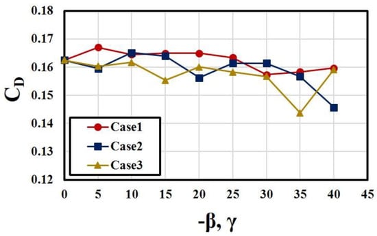 Figure 7 shows that the drag coefficient does not vary largely in all the cases except at the angles larger than 30°. The differences in CD among the cases are not large, either. It is interesting that an increase in the bending angle with β = 0° also slightly reduces CD at γ = 30–40° compared to the case without bending (Case 1). A sudden decrease in CD is found at γ = −β = 35° in Case 3, but there is no noticeable change at this angle in Case 1.