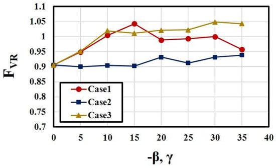 To further analyze the causes of the above results for the aerodynamic performance, changes in the characteristics of the fluidic oscillators depending on the bending and/or pitching angles are presented in Figure 9, Figure 10 and Figure 11. Figure 9 shows variations of the peak velocity ratio (FVR) with the angles in the three cases. The results show that FVR is far more affected by the bending angle (Case 1 and Case 3) than by the pitch angle (Case 2). The effect of pitch angle on FVR appears beyond −β = 15° (Case 2). However, the effect of bending angle on FVR is found over the whole tested range of γ and −β (Case 1 and Case 3). Case 3 shows higher FVR than that of Case 1 for −β > 15°, where contribution of the pitch angle to FVR is found in Case 2.