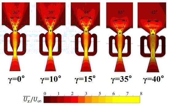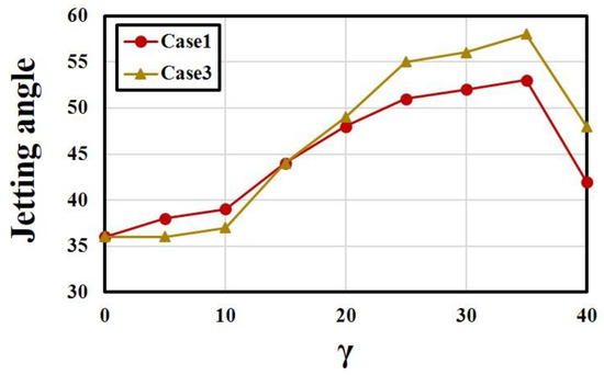 The jetting angle of fluidic oscillators is also strongly affected by the bending angle of the oscillator outlet nozzle. Figure 10 and Figure 11 show that the jetting angle increases rapidly with the bending angle and reaches the maximum at γ = 35° in both Case 1 and Case 3. In Figure 10, both curves for Case 1 and Case 3 show the similar variations, but there must be some contribution of pitch angle to the enhancement of jetting angle for γ = −β > 15° in Case 3. The sudden decrease in the jetting angle at γ = −β = 40° in Case 3 is affected strongly by the bending of the oscillators as shown in Case 1. At this angle, there must be a suppression of oscillation by the bending as reported by the previous work [27]. Therefore, the improved characteristics of the fluidic oscillators (FVR and jetting angle) shown in Figure 9 and Figure 10, especially the jetting angle, must have increased CL and thus CL/CD in Case 3 as shown in Figure 6 and Figure 8, respectively.