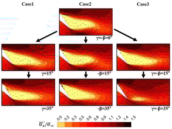 Time-averaged streamwise velocity contours and velocity vectors for different γ and/or −β angles on x-z plane at the center of computational domain (α = 8°, δf = 40°).