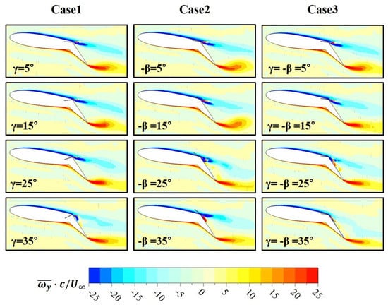 In Figure 13, time-averaged span vorticity distributions around the airfoil are compared at various angles. It is known that positive vortices generally contribute to the thrust, and negative vortices affect the lift [32]. In Case 1, at γ = 35°, the area of negative vorticity is attached to the flap surface, but this kind of attachment is not found in Case 2 with the change of β. When γ and −β are simultaneously changed in Case 3, the area of negative vorticity is attached to the flap surface at γ = 25° and 35°. This means that the coupling effect of γ and β promotes the attachment and thus enhances the aerodynamic performance.