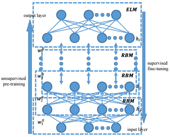 However, the random setting of the weights of DBN’s output layer increases the randomness of the model’s prediction performance. To further improve the stability of prediction performance and generalization performance, Li proposed to adopt the extreme learning machine (ELM) algorithm after the weights of the first n-1 layers were obtained using the CD algorithm to determine the weights of the output layer, and establish a soft sensor based on an improved deep belief network (IDBN) to predict the VFA concentration. IDBN structure diagram is presented in Figure 3.