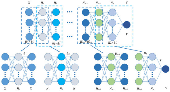 In the anaerobic digestion process, the long period and high cost of target variable collection make it difficult for soft sensors to obtain sufficient labeled samples [102]. However, there are many unlabeled samples composed of process variables in the industrial process. With the semi-supervised learning mechanism, the information of unlabeled samples can be fully mined, and the prediction accuracy and generalization ability of soft sensors are improved. In recent years, semi-supervised learning mechanisms have been widely used in deep neural networks. Therefore, Yan proposed a soft sensor based on the semi-supervised hierarchical extreme learning machine to predict VFA concentration in the anaerobic digestion process [103]. The model structure of the semi-supervised hierarchical extreme learning machine is illustrated in Figure 5.