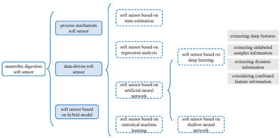 In terms of anaerobic digestion process variables monitoring, there is mature and reliable online monitoring equipment for temperature, pressure, flow rate, gas composition, and other variables [10,11]. However, there are still many key variables that cannot be directly measured, or the measurement equipment is expensive [12], such as biogas yield, chemical oxygen demand (COD), and VFA concentration. Online monitoring equipment for these variables cannot be widely used in industrial production due to factors such as expensive equipment, low accuracy, and lagging analysis [13,14,15,16]. Consequently, the soft sensor using online measurable auxiliary variables to estimate the unmeasurable variables in real-time has been broadly used in the anaerobic digestion process [17,18]. The soft sensor is developed based on the inference control theory proposed by Brosilow [19], suggesting that the mathematical relationship between auxiliary variables and target variables is established under certain optimal criteria, and the selection of auxiliary variables should be measurable and easy-to-obtain [20]. Real-time monitoring of target variables is achieved through software [21]. Since the soft sensor has the advantages of fast response, low cost, easy implementation, and simple maintenance [22], it has been widely used in monitoring, optimization, and control of engineering [23]. Soft-sensor technology is broadly based on two modelling approaches: those derived mechanistically and those that are data-driven [24]. Specifically, mechanism models can be classified into common mechanism models and state estimation and system identification based on mechanism models [25]. Data-driven models can be divided into statistical machine learning models and deep learning models.