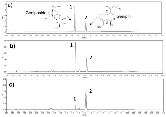 Genipin can quickly react with amino acids in the presence of oxygen to produce a blue color complex [7]. Geniposide represents more than 70% of the iridoid content in the unripe genipap [8]. To obtain the blue-color complex, geniposide requires hydrolysis, often mediated by enzymes [8,9,10].