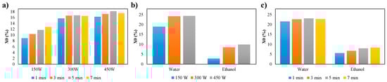 The efficiency of the extraction process depends on the nature of the compounds present in the raw material. The use of water, a solvent with higher polarity, allowed enhancing the X0 compared with ethanol, as represented in Figure 2b,c. In other words, the use of water as the solvent increased X0 by 4- to 8-folds at 150 W and 1- to 3-folds at 300 and 450 W (Table 1). Therefore, it can be concluded that water, especially for low ultrasound power, could access and solubilize a great number of molecules in the SDG, resulting in higher X0. It is known that during the UAE, two mechanisms of mass transfer can occur: diffusion through the cell walls and washing out (rinsing) the cell contents once the walls are broken [30]. As the used material was dry and milled, once it is rehydrated, there is swelling during the steeping extraction stage, resulting in the fragmentation of the vegetal material, which increases the transfer of compounds from the raw material into the solvent [31].