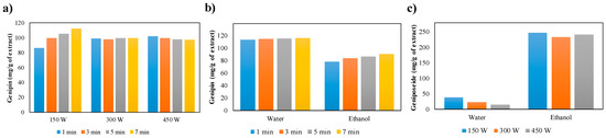 The highest genipin content (121.7 mg/g extract or 26.9 mg/SDG) was recovered at 150 W in 7 min using water as the solvent. This result is comparable with that extracted in our previous work from the whole unripe genipap without peel applying the low-pressure solvent extraction (LPSE) method with water at 40 °C and 1 bar for 25 min (233 mg/g extract) [34], and 81–196 mg/g unripe genipap obtained from crude genipap extracted with enzymes for 150 min [10]. It is worth mentioning that the extraction times used by these authors were much higher than the times used in this study. Considering that 7 min is a short time to extract bioactive compounds from a by-product plant matrix, the UAE was efficient in recovering such a target compound.