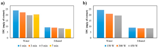 Effect of the process parameters on TPC: (a) solvent and extraction time and (b) solvent and power. Results expressed on a dry basis. Standard deviation by ANOVA for TPC = 0.9.
