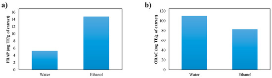 Effect of the solvent on antioxidant capacity: (a) effect of the solvent on FRAP and (b) effect of the solvent on ORAC. Results are expressed on a dry basis. Standard deviation by ANOVA for FRAP = 1 and for ORAC = 9.