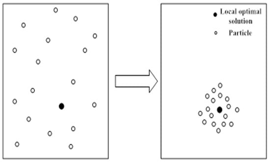 Because of the advantages of a distributed search, only a few parameters, and simple implementation, the PSO algorithm is often used to find an optimal solution. However, it also has some disadvantages, as shown in Figure 10. When it finds the optimal solution in the region, it concludes that it has found the global optimal solution. It soon stops iteration, falls into the local optimal solution, and cannot find the global optimal solution, resulting in poor solution quality.