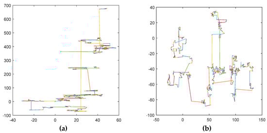 Trajectory simulation of Lévy flight: (a) 500 iterations of flight trajectory; (b) 1000 iterations of flight trajectory.