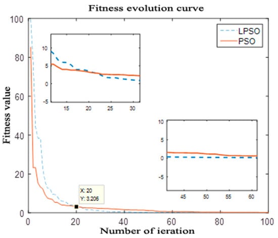 (1) In terms of stability, for these two fitness curves, it is obvious that the LPSO algorithm had good robustness, while the PSO algorithm had poor robustness, especially in multi-peak functions.