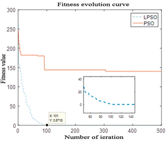 (2) From the perspective of convergence speed, the Sphere function using the LPSO algorithm was better than the PSO for the early convergence rate, but in the second half of the number of iterations after more than 20 times, the LPSO algorithm’s convergence rate was significantly higher than the PSO. When the number of iterations reached 45 times, the LPSO algorithm had determined the optimal solution, but the unimproved PSO algorithm was still in the process of seeking an optimal solution; When the Rastrigin function was solved by the LPSO algorithm, the convergence rate was significantly higher than that of the PSO algorithm. When the number of iterations reached 100, the Rastrigin function tended to the optimal solution, while the latter did not obtain the optimal solution after 500 iterations. In the second half of the function, after several MATLAB simulations, the PSO algorithm easily fell into the local optimal solution. Although the PSO algorithm was successful in solving the single-peak function, its effect was not good in seeking the extreme value of the multi-peak function. The LPSO algorithm successfully jumped out of the local optimal solution and converged to the global optimal solution in the solution of both functions. Therefore, no matter the above aspects, the improved LPSO algorithm was superior to the PSO algorithm.