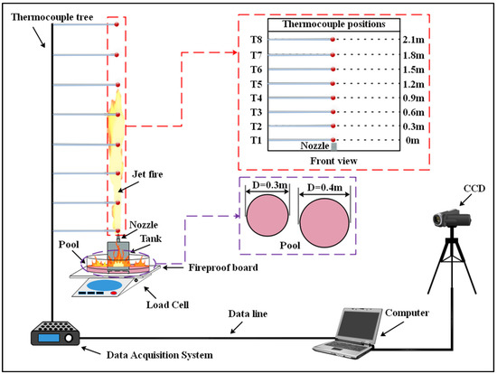 All experiments in this study were carried out in the same tunnel, and the tunnel door was closed but not sealed before each experiment to ensure that the experiment was completed in a still air environment. Figure 1 shows a schematic diagram of the experimental device. The experimental device shown in Figure 1 consists of a fuel supply system, a measurement system and a data acquisition system.