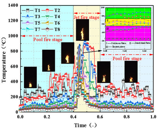 The temperature data are measured by K-type thermocouple with a diameter of 1 mm. Before the experiment, the reading measured by the thermocouple has been corrected with the radiation loss according to the diameter of the thermocouple. Due to the extremely high flame temperature of the jet fire, the temperature measuring probe at the flame needs to check whether it is burned out after many experiments. Once it is found that it is damaged, it is necessary to replace new thermocouples in time.